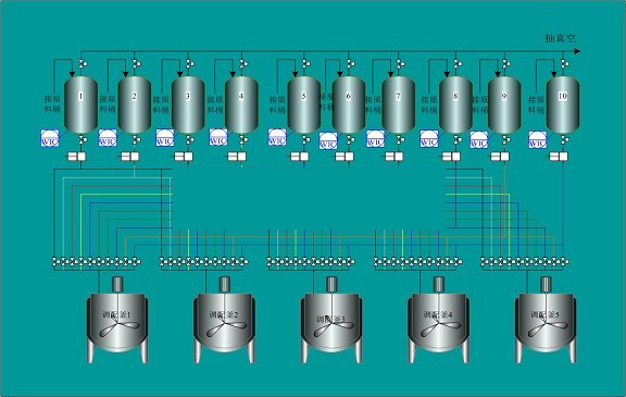 Các vật liệu được bơm từ khu vực bể hoặc bể trung gian, thùng nguyên liệu thô đến bể đo trọng lượng cấp cao. Sau đó, theo các yêu cầu công thức, vật liệu xe tăng trọng lượng cao được đặt tuần tự hoặc đồng thời vào ấm pha, và van xả được kiểm soát theo giá trị công thức để hoàn thành việc kiểm soát batching tự động của một lô